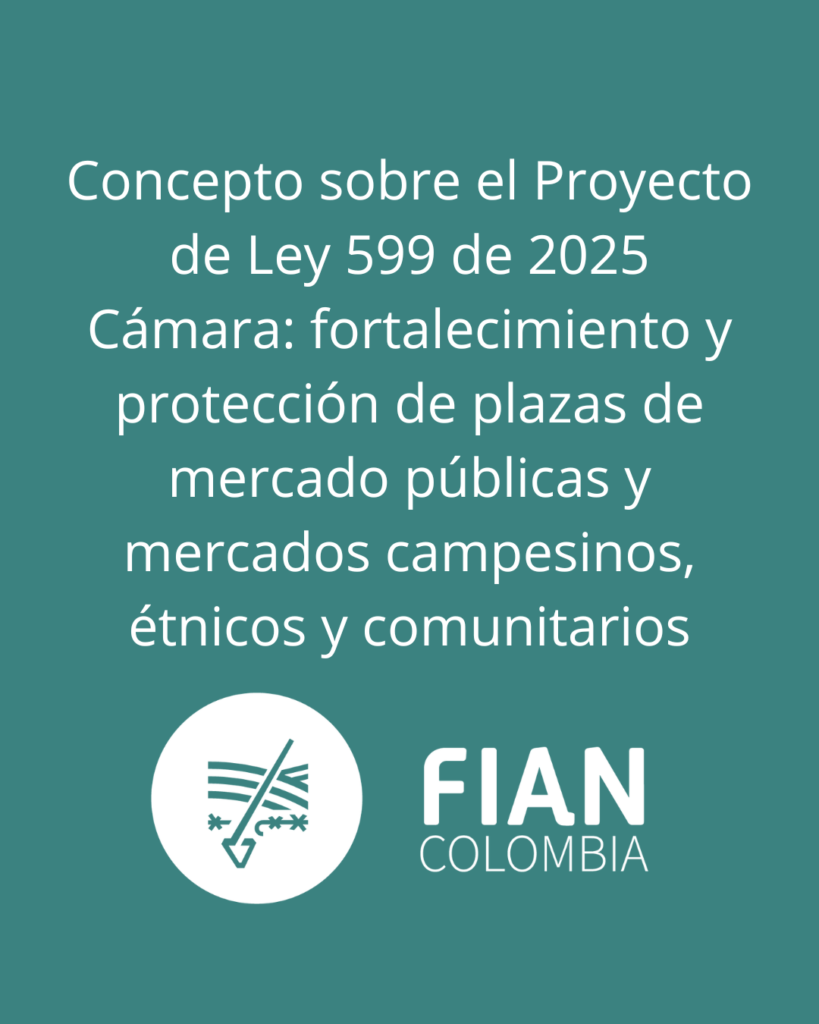 Concepto técnico presentado a la Comisión Quinta de Cámara. Defiende el fortalecimiento y protección de plazas de mercado públicas y mercados campesinos, étnicos y comunitarios como espacios clave para la soberanía alimentaria, la economía campesina, familiar y comunitaria y la alimentación real. Recomienda ajustes al articulado para garantizar participación efectiva, enfoque territorial, de género y de DHANA.