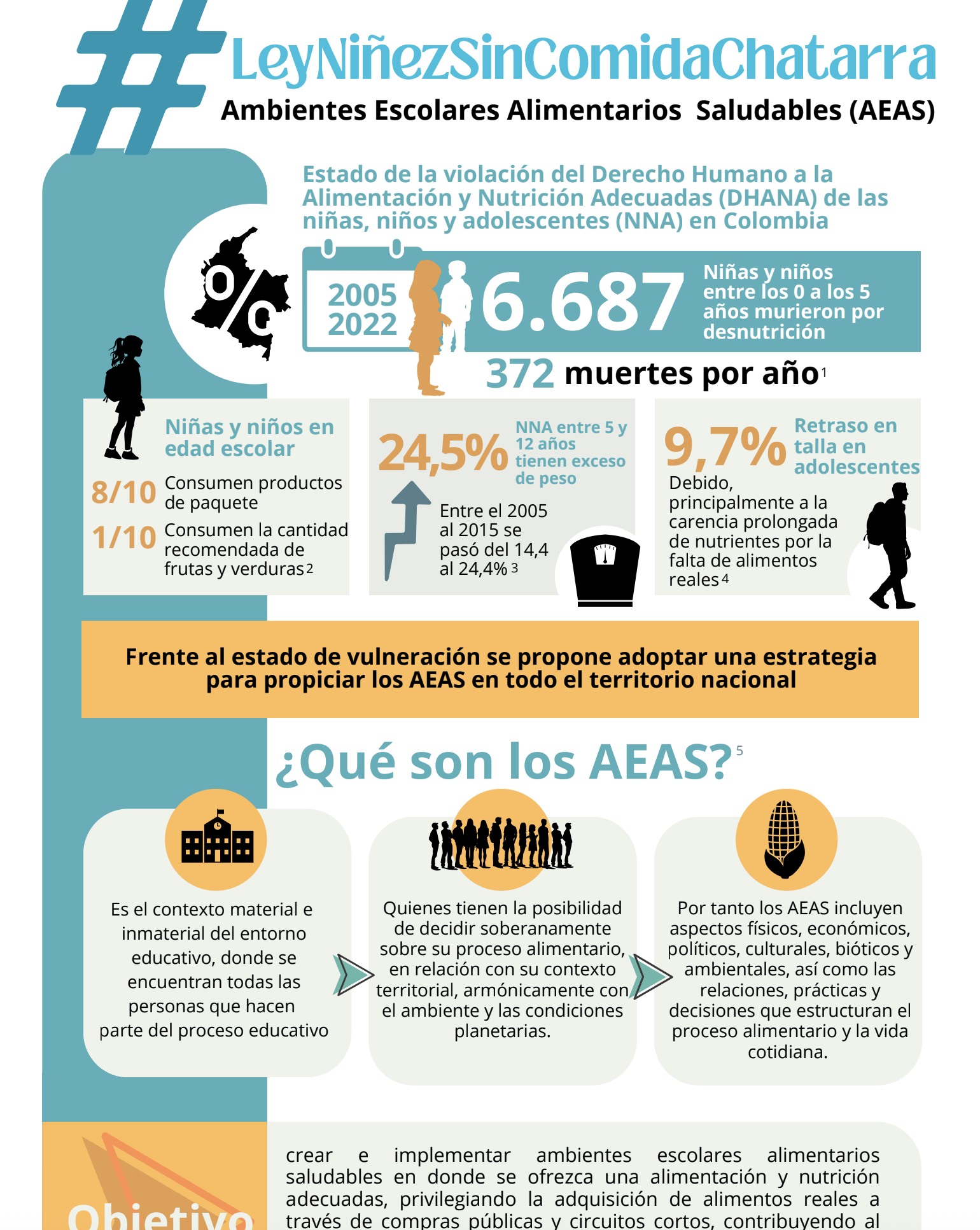 Infografía que presenta datos sobre vulneración del derecho a la alimentación de niñas, niños y adolescentes y explica el concepto de Ambientes Escolares Alimentarios Saludables (AEAS). Propone garantizar alimentos reales en las escuelas, restringir comida chatarra, articular el PAE con el DHANA y fortalecer compras públicas a la agricultura campesina, familiar y comunitaria.